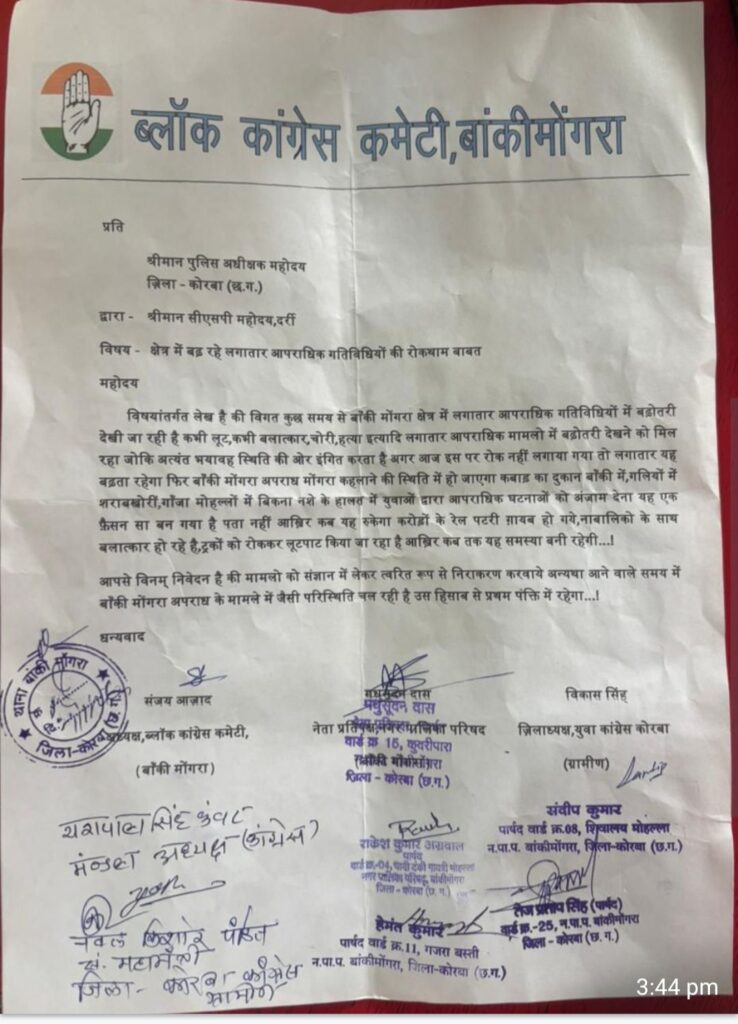 मामलो को संज्ञान में लेकर त्वरित रूप से निराकरण करवाने की माँग कि गई एव आने वाले समय में बाँकी मोंगरा अपराध के मामले में जैसी परिस्थिति चल रही है उस हिसाब से प्रथम पंक्ति में रहेगा…!