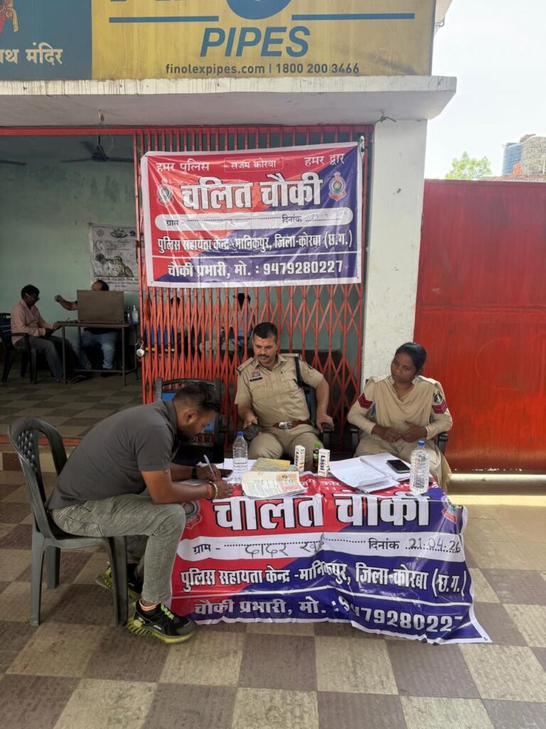 पुलिस अधीक्षक, जिला कोरबा के निर्देशन एवं अतिरिक्त पुलिस अधीक्षक तथा नगर पुलिस अधीक्षक के मार्गदर्शन में दिनांक 23.04.2026 को पुलिस सहायता केंद्र मणिकपुर क्षेत्रांतर्गत दादर में “चलित थाना” का सफल आयोजन किया गया।यह अभिनव पहल आम नागरिकों को त्वरित, सुलभ एवं प्रभावी पुलिस सेवा प्रदान करने के उद्देश्य से की गई, जिसके अंतर्गत पुलिस टीम सीधे आमजन के बीच पहुँची।आयोजन स्थल पर अस्थायी पुलिस सहायता केंद्र स्थापित कर नागरिकों की शिकायतें दर्ज की गईं एवं उनकी समस्याओं को गंभीरता से सुना गया।