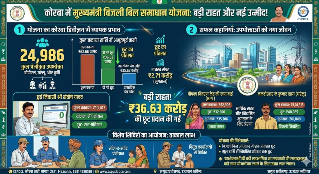 इन तीनों उदाहरणों से स्पष्ट होता है कि मुख्यमंत्री बिजली बिल समाधान योजना केवल आंकड़ों की सफलता नहीं है, बल्कि यह आम लोगों की जिंदगी में वास्तविक बदलाव ला रही है। योजना की सफलता का दायरा भी व्यापक है। छत्तीसगढ़ राज्य विद्युत वितरण कंपनी लिमिटेड के ओ एंड एम डिवीजन कोरबा में 24,986 उपभोक्ताओं ने पंजीयन कराया। इन पर कुल ₹62.66 करोड़ का बकाया था, जिसमें से ₹36.63 करोड़ की छूट प्रदान की गई। अब तक ₹2.71 करोड़ की राशि जमा हो चुकी है, जिससे विभाग को भी राजस्व संग्रह में मजबूती मिली है और उपभोक्ताओं में विश्वास बढ़ा है।