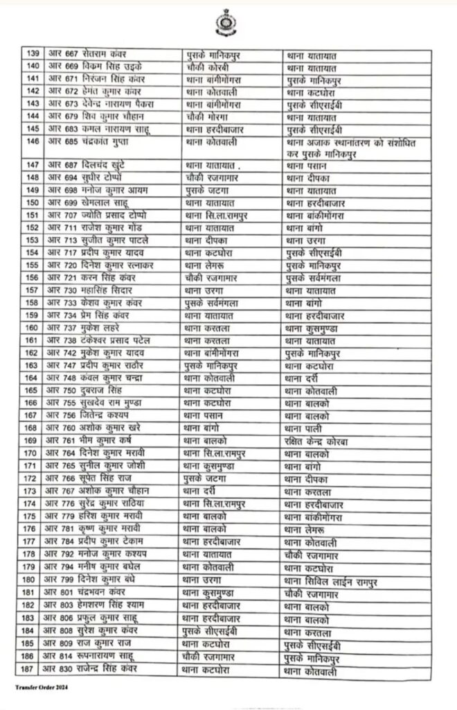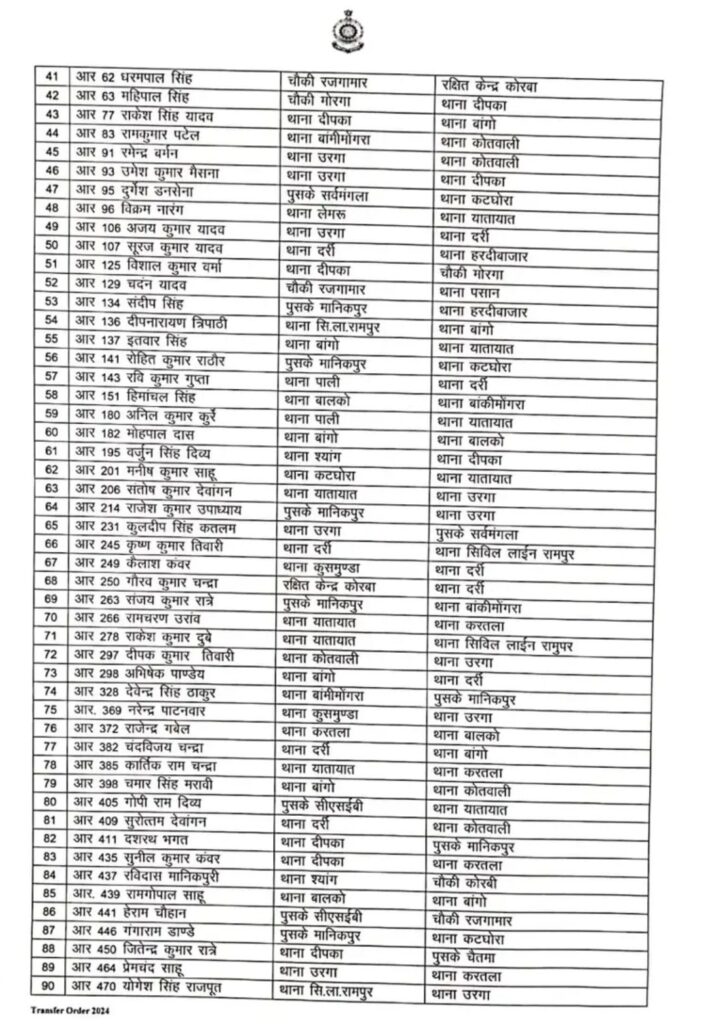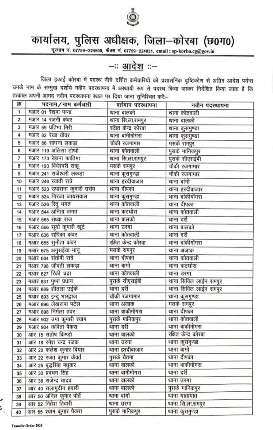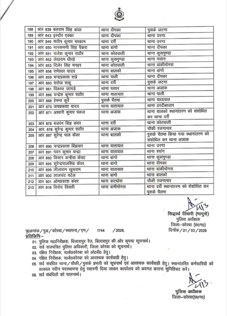 बड़ी खबर | कोरबा (छत्तीसगढ़) छत्तीसगढ़ के कोरबा जिले से एक बड़ी प्रशासनिक खबर सामने आई है। जिले में 213 पुलिस कर्मियों का एक साथ तबादला किया गया है। इस व्यापक फेरबदल से पुलिस विभाग में हलचल तेज हो गई है।