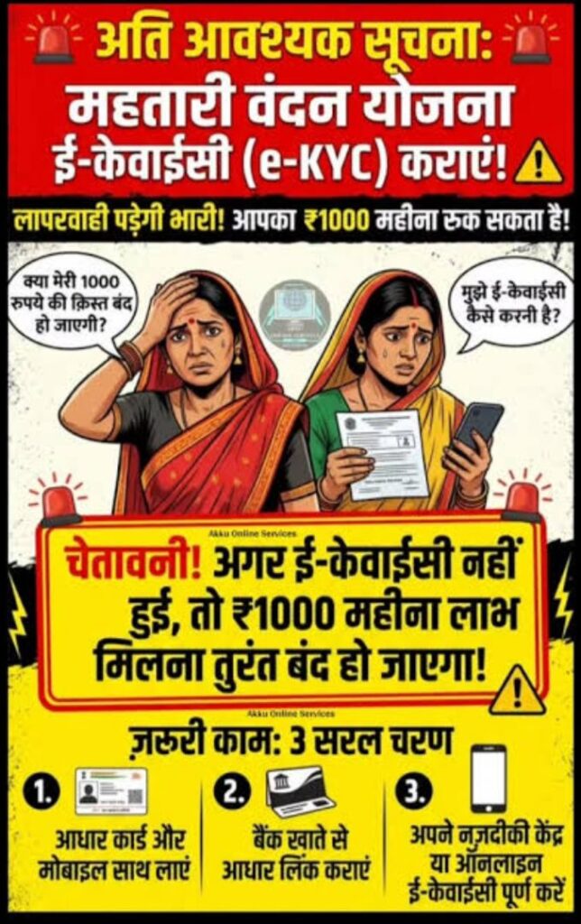 👉 ई-केवाईसी क्यों है जरूरी? = ई-केवाईसी एक डिजिटल सत्यापन प्रक्रिया है, जिसके माध्यम से हितग्राही की पहचान और पात्रता की पुष्टि की जाती है। सरकार का उद्देश्य यह सुनिश्चित करना है कि योजना का लाभ केवल वास्तविक और पात्र महिलाओं तक ही पहुंचे। कई मामलों में गलत जानकारी, डुप्लीकेट नाम या अपात्र लोगों द्वारा लाभ लेने की शिकायतें सामने आई थीं, जिन्हें रोकने के लिए ई-केवाईसी अनिवार्य किया गया है।